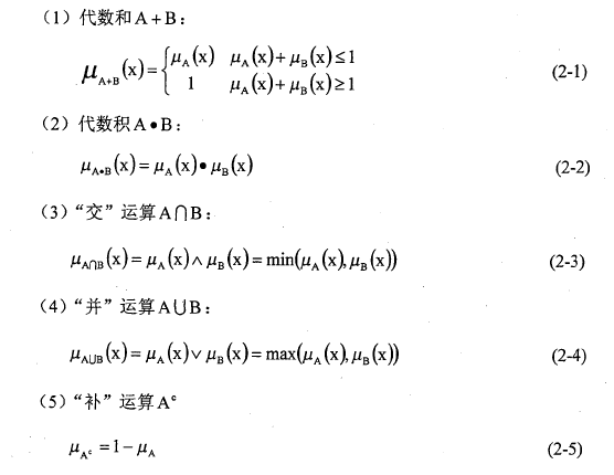對模糊集合運(yùn)算時,注意要有同等個數(shù)的集合元素參加運(yùn)算。模糊集合的運(yùn)算可分為代數(shù)運(yùn)算和邏輯運(yùn)算,主要有以下幾種: